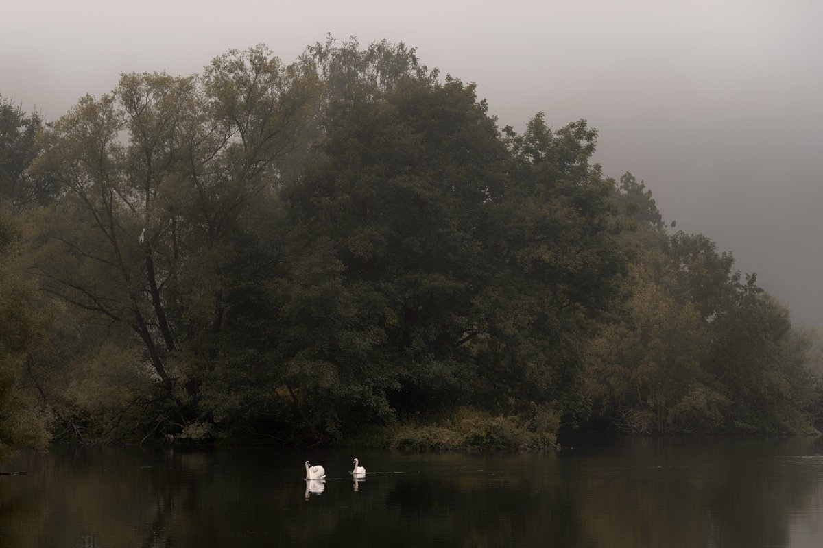 Zwei Schwäne auf der Ruhr bei Kemnade. Der Herbst kommt. Meteorologisch betrachtet ist der schon seit 15 Tagen da und langsam sieht ... knieb.es/1d13 #landscape #river #fog #autumn #nikonphotography