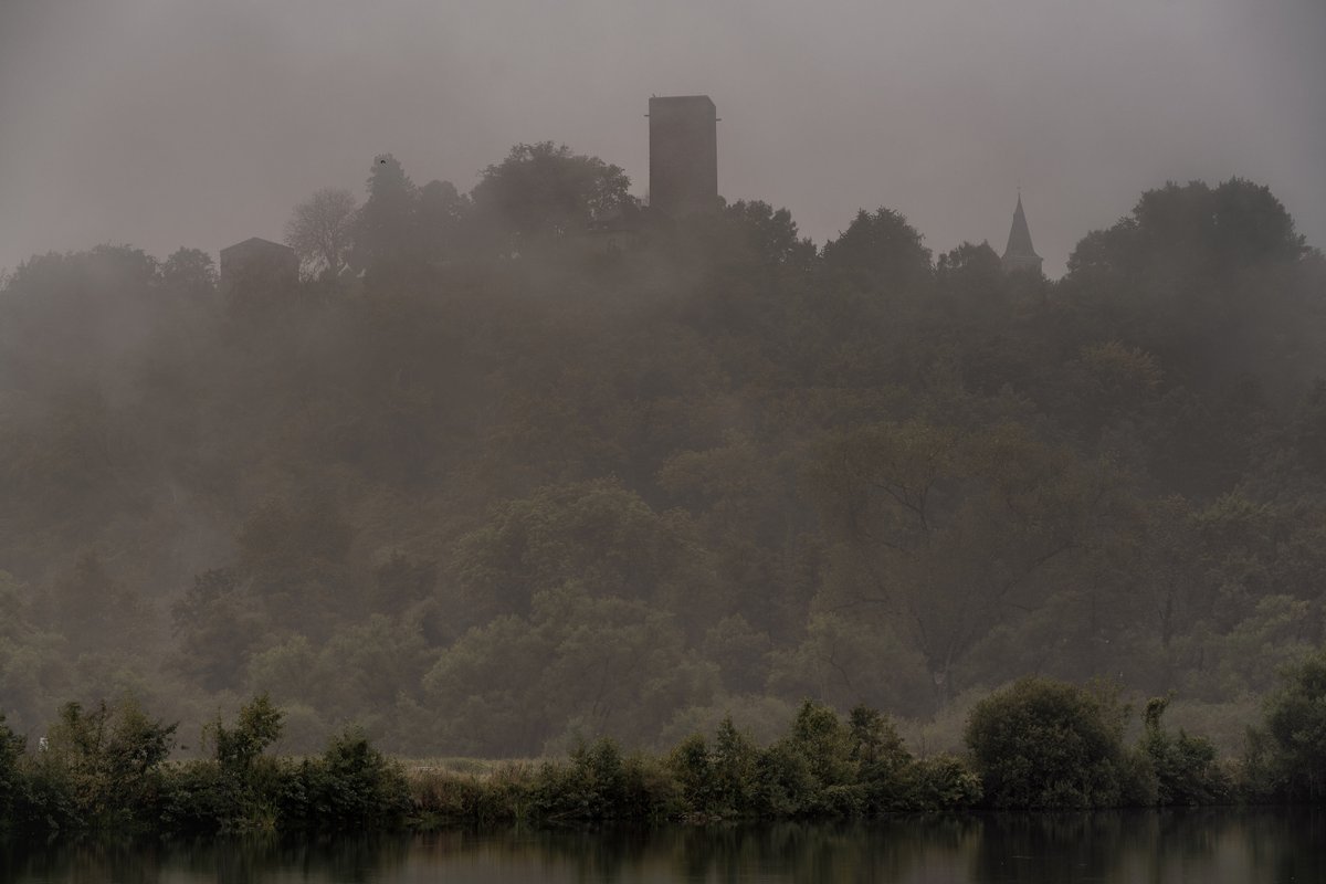 Die Burg Blanksten und der Kastenstein im Nebel. Das Foto habe ich am gleichen Tag nur etwas später gemacht. Dieses ist mit 105 mm anstelle knieb.es/1d1d